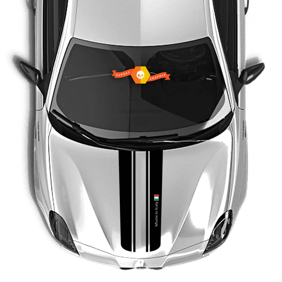The "Made in Italy" sticker design is complemented by a small Italian flag, creating an elegant and stylish appearance. These hood decals are designed to highlight your vehicle's origins and add a little Italian flair.