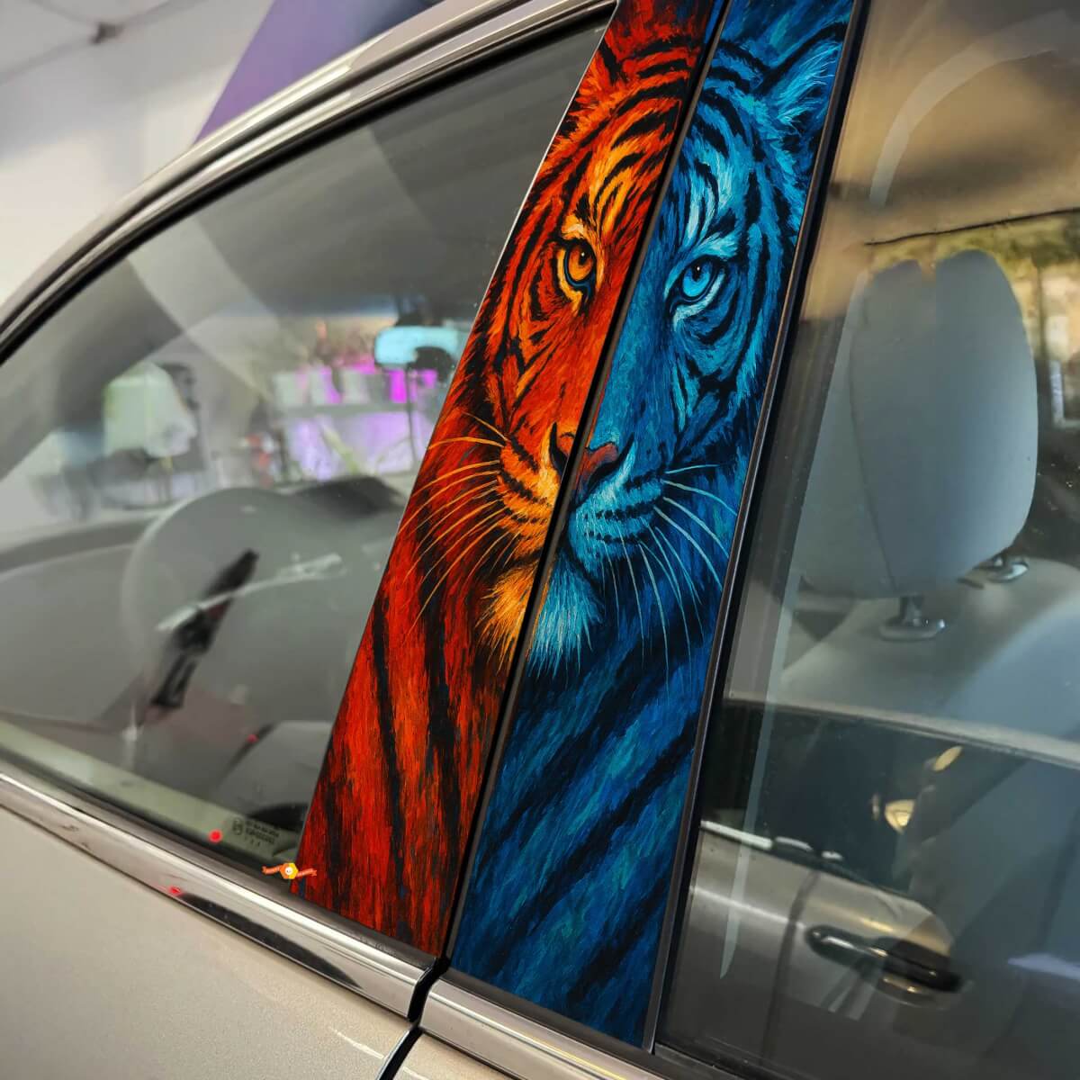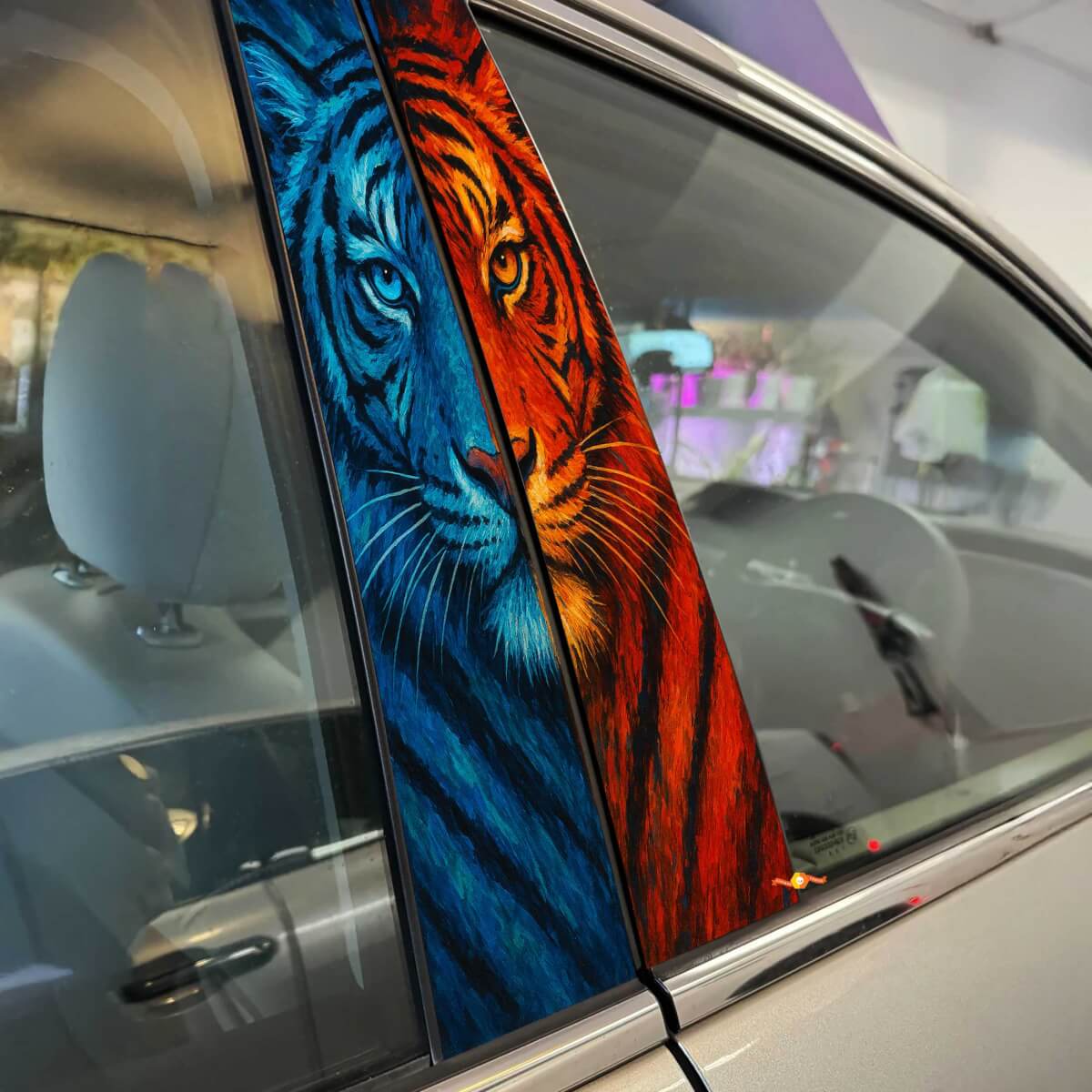 Enhance your vehicle's style with our Two Tone Tiger Guise Pillar Doors Vinyl Decal Sticker. This eye-catching decal features a bold tiger design in a striking two-tone color scheme, perfectly crafted to add a fierce and unique touch to your car's pillar doors. Made from high-quality vinyl, it’s designed to withstand weather elements and provide long-lasting durability without fading or peeling.
